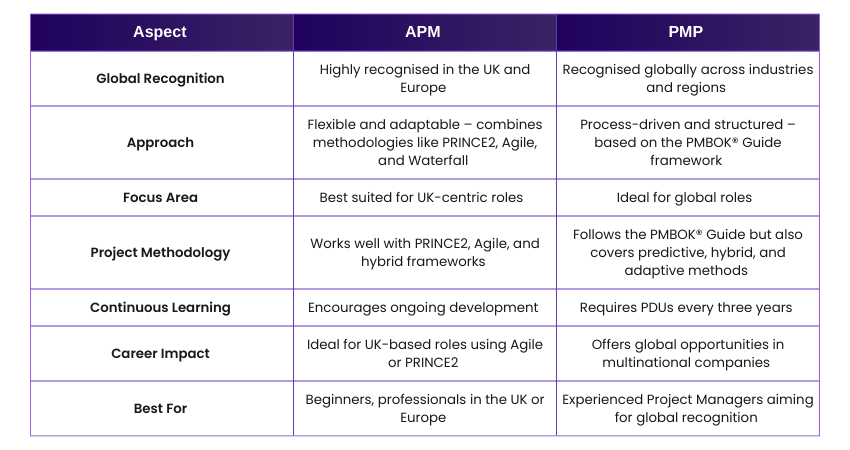 APM and PMP differ in their approach, structure, global reach, and industry relevance. Let’s check their difference in detail: