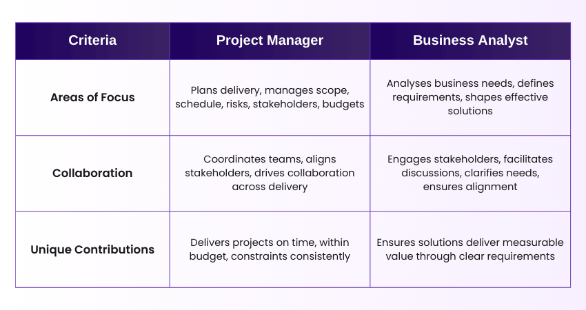 Here are the key differences between Business Analyst vs Project Manager: