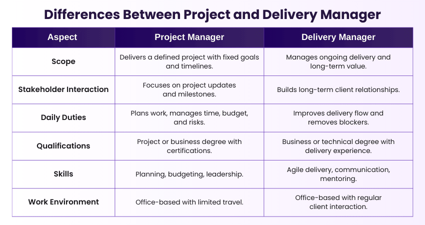 For an effective understanding between Delivery Manager vs Project Manager, it is essential to look at their key differences. This will help professionals to identify which career path suits their goals and organisations to choose the right role for their specific needs. Let’s look at them below.