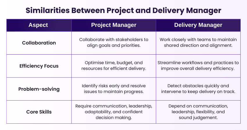Let’s look at some of the key similarities between Delivery Manager vs Project Manager in the table below: