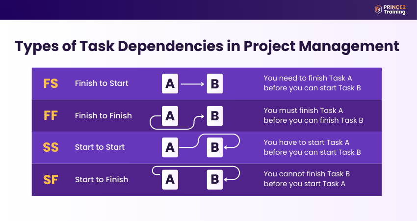 So far, you have an understanding of the types of Dependencies. Now, you need to know the four Types of Task Dependencies in every project: