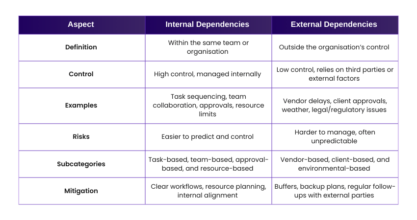 External dependencies involve factors or parties outside the project team, while internal dependencies exist within the team or organisation. Understanding both helps in better planning, coordination, and risk management.