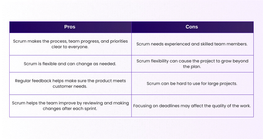 The Scrum framework is a popular way to manage projects, with both benefits and challenges. Let’s look at some key pros and cons of using Scrum: