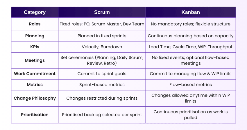 Kanban vs Scrum are two of the widely used Agile methods. Understanding their key differences will help you understand which to choose for your project needs. Let’s look at them below.