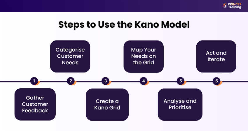 Applying the Kano Model involves a structured process that helps organisations understand customer needs and prioritise features effectively. It enables teams to focus on what customers truly value, reduce guesswork, and make better product decisions. The key steps are outlined below: