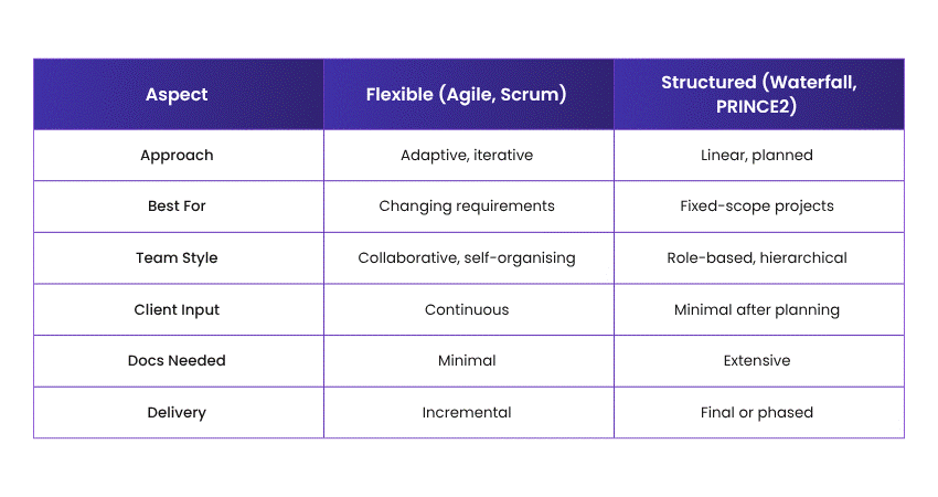 For fixed deadlines or strict budgets, DSDM or Lean and Critical Path Method (CPM) help prioritise essential features. Fully planned approaches like Waterfall and PRINCE2 are suitable when project constraints must be clear upfront.