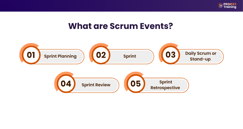Scrum Events are regular meetings that the Scrum Team follows in order. These help the team stay on track and work better together. Here are the main Scrum Events:
