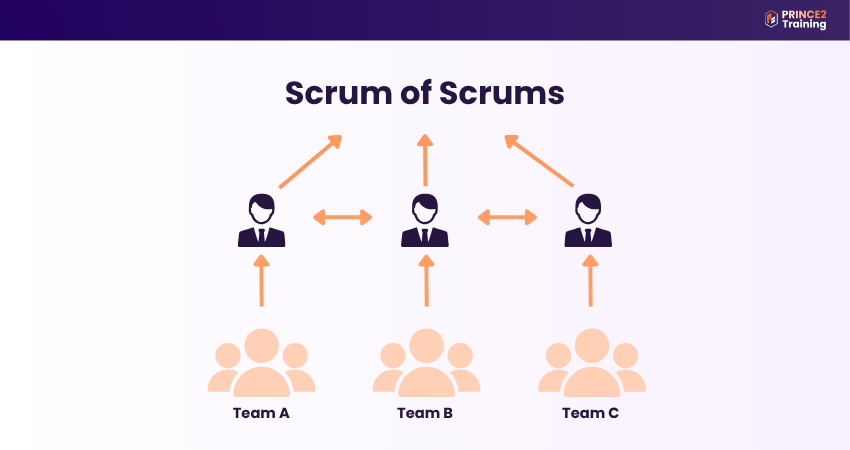 Each team sends one employee, usually a Scrum Master, to a regular meeting. They share updates, discuss blockers, manage dependencies, and align sprint goals across teams.